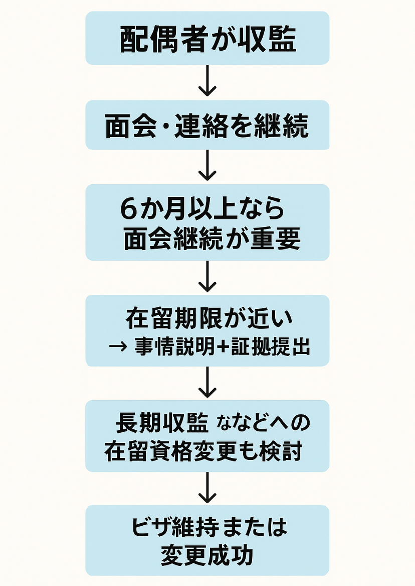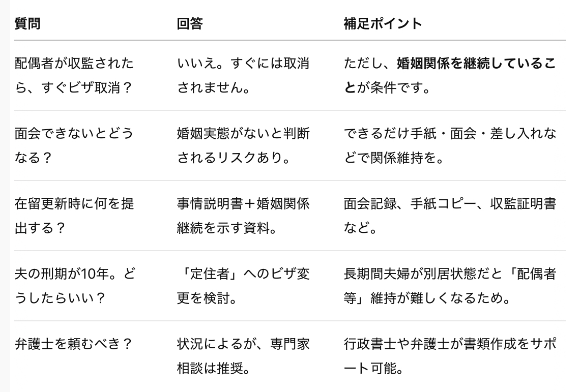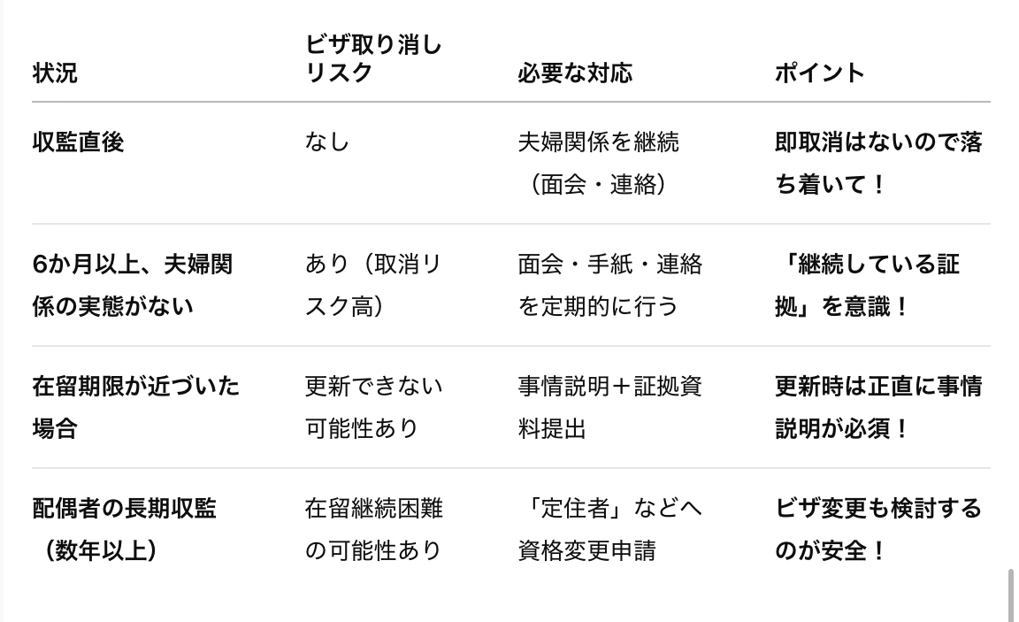 また、配偶者の刑期が長い場合、在留資格変更(例:定住者ビザへの変更)を考えた方が安全です。