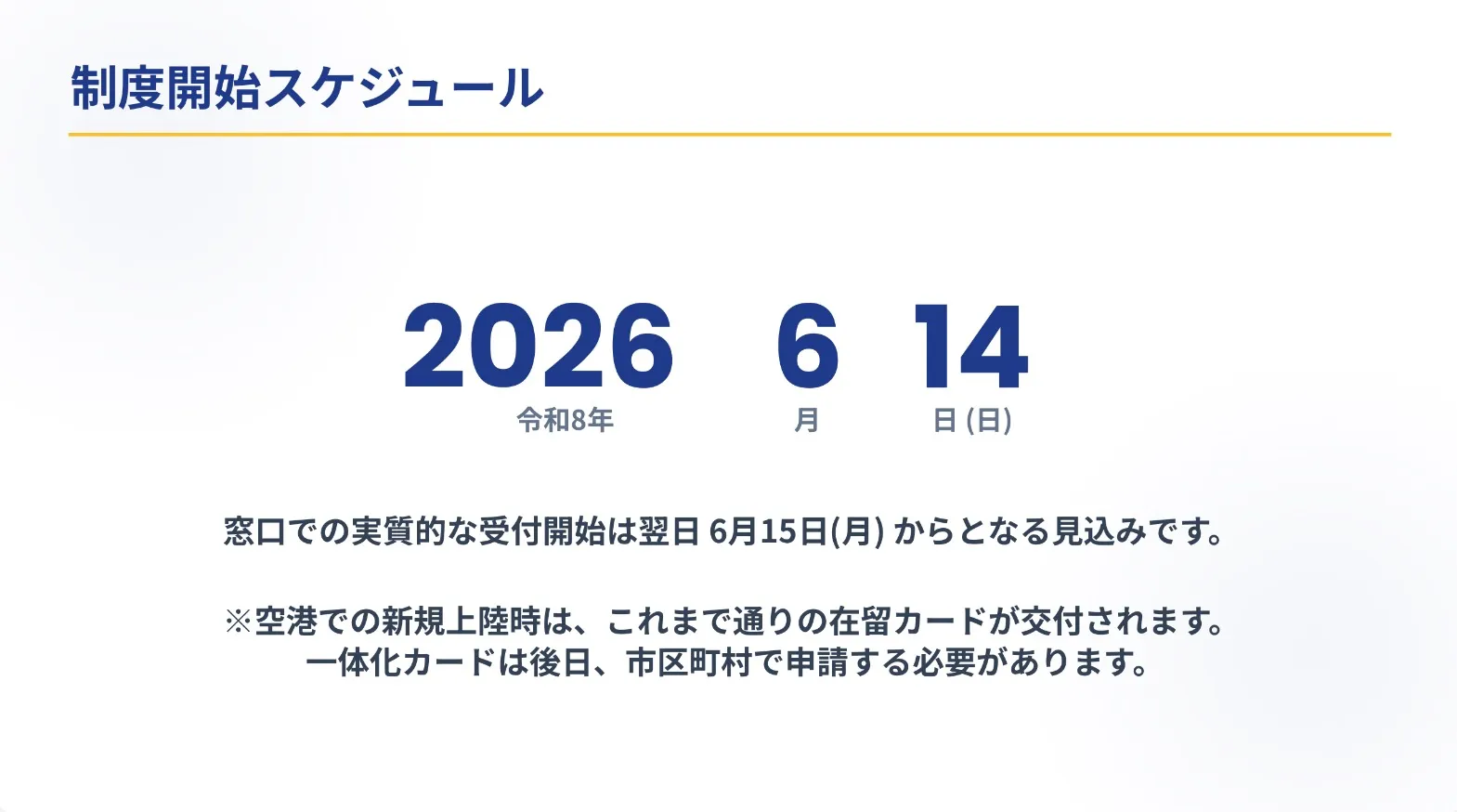 【注意点】 日本に初めて入国する際(空港など)では、まだ「特定在留カード」は発行されません。まずは通常の在留カードを受け取り、その後、市町村で住居地の届出をする際に一体化への切り替えを申請する流れになります。