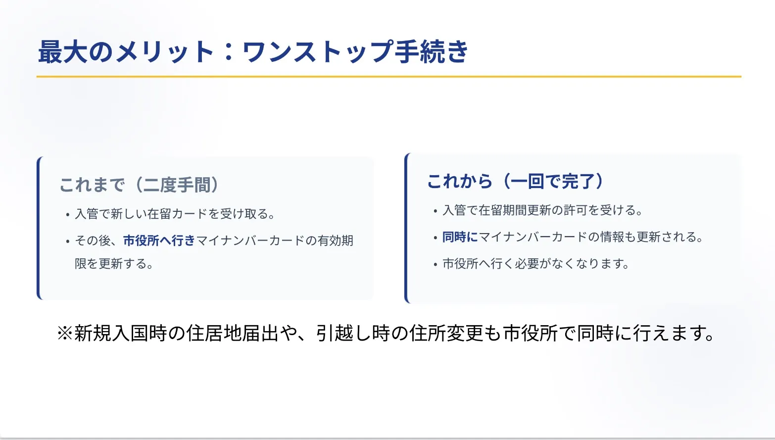 一体化の最大のメリットは、役所の手続きが楽になることです。これまでは、引越しやビザ更新のたびに「入管」と「市役所」の両方へ行く必要がありましたが、これが簡素化されます。