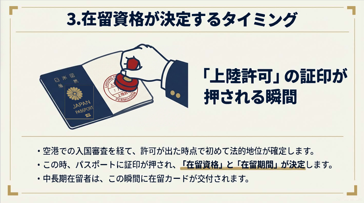 ✅ 在留資格が付与されるのは「入国審査(上陸許可)のとき」
