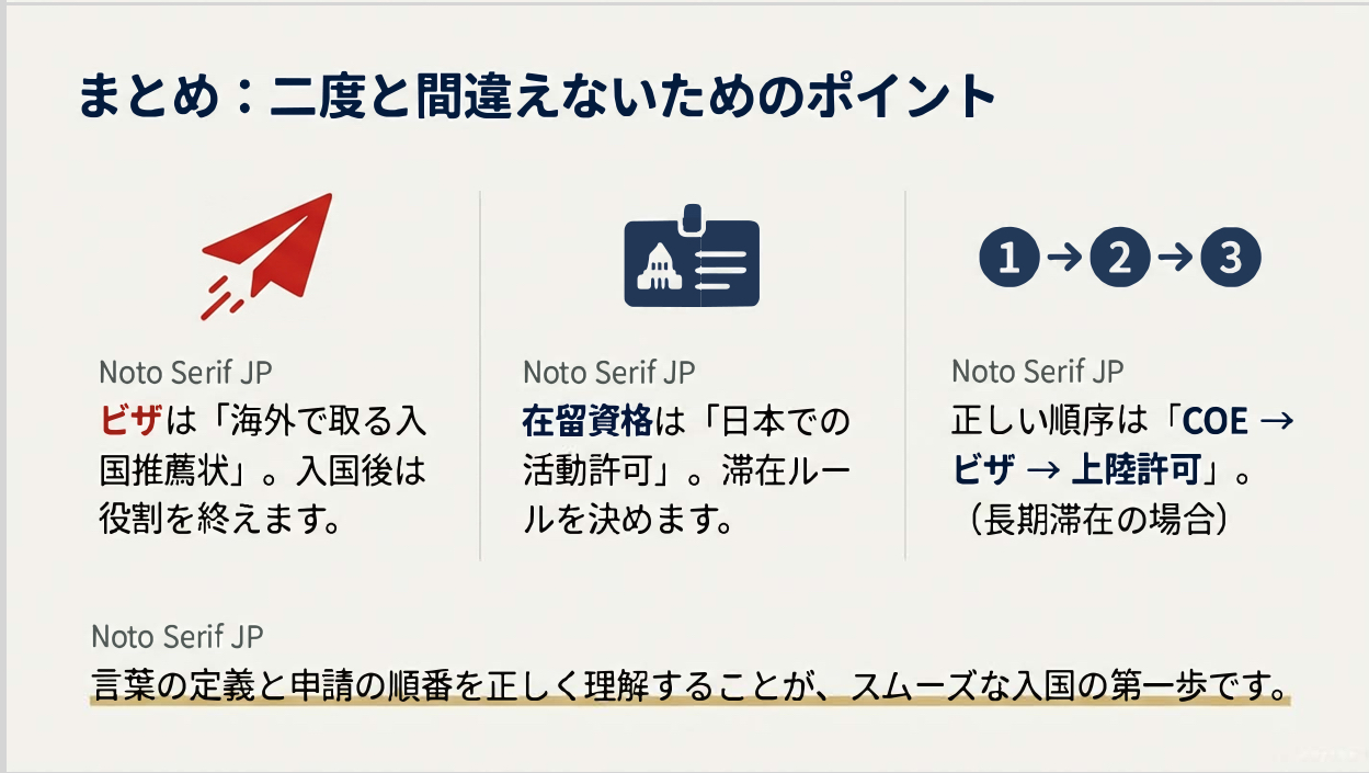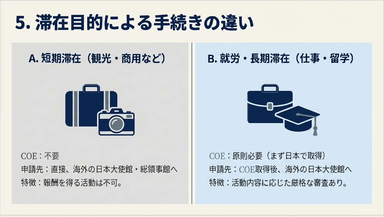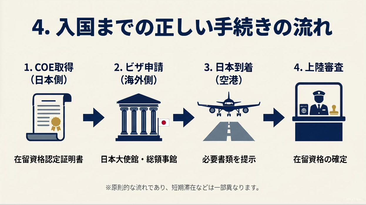 - ほぼ必ず COE → ビザ → 上陸許可 のルート
