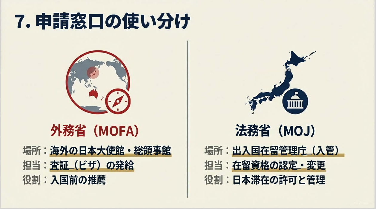 理由は簡単で、ここは「法律」だけでなく **運用(入管実務)**が強く出るからです。