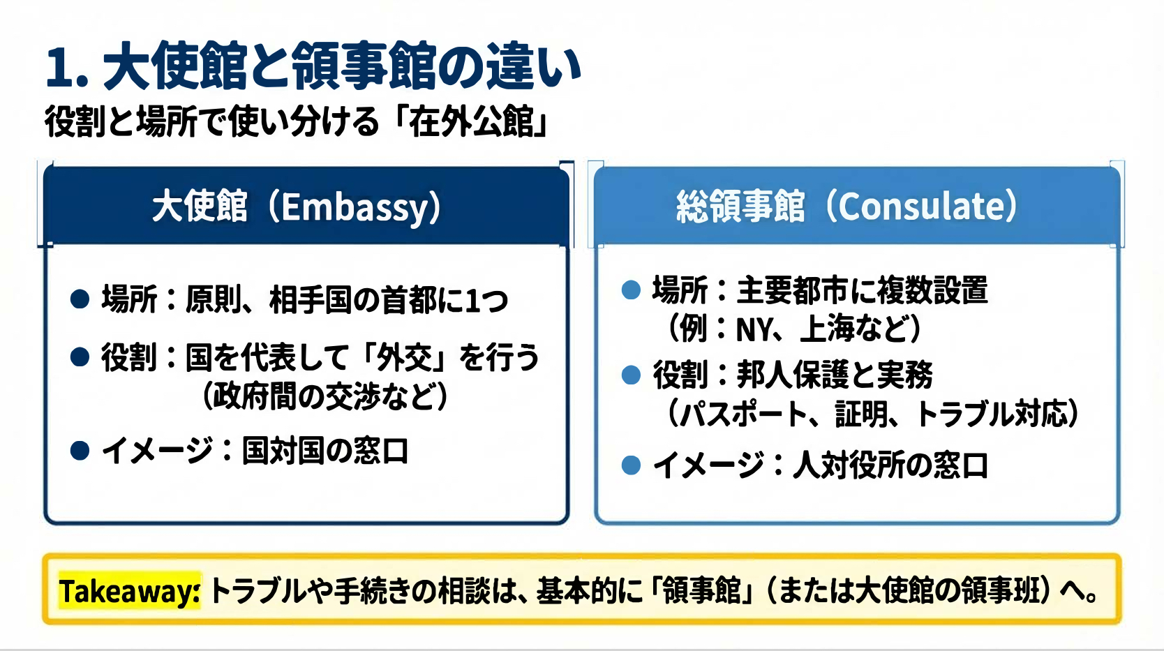 ✅1. 在外公館(大使館と領事館)の違いと役割