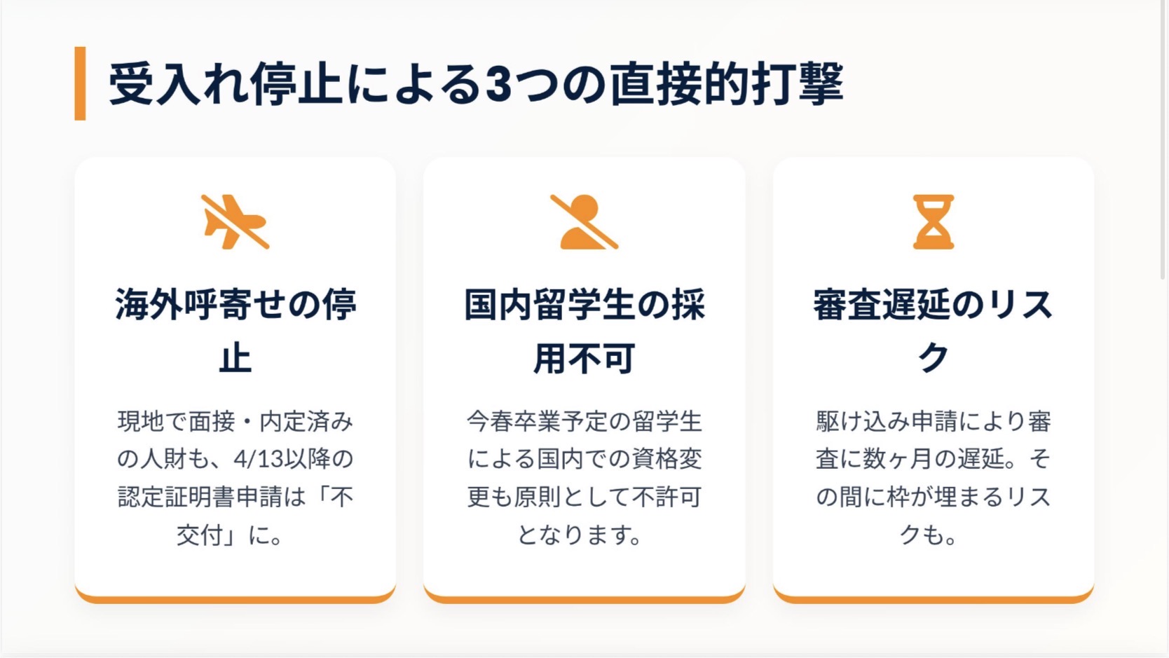 海外にいる外国人を新たに採用し、日本へ呼び寄せるための「在留資格認定証明書交付申請」は、**4月13日以降に受理されたものについては、原則として「不交付」**となります。 多額の採用コストや現地での面接費用をかけて準備を進めていた場合でも、入国できないという極めて厳しい事態となります。