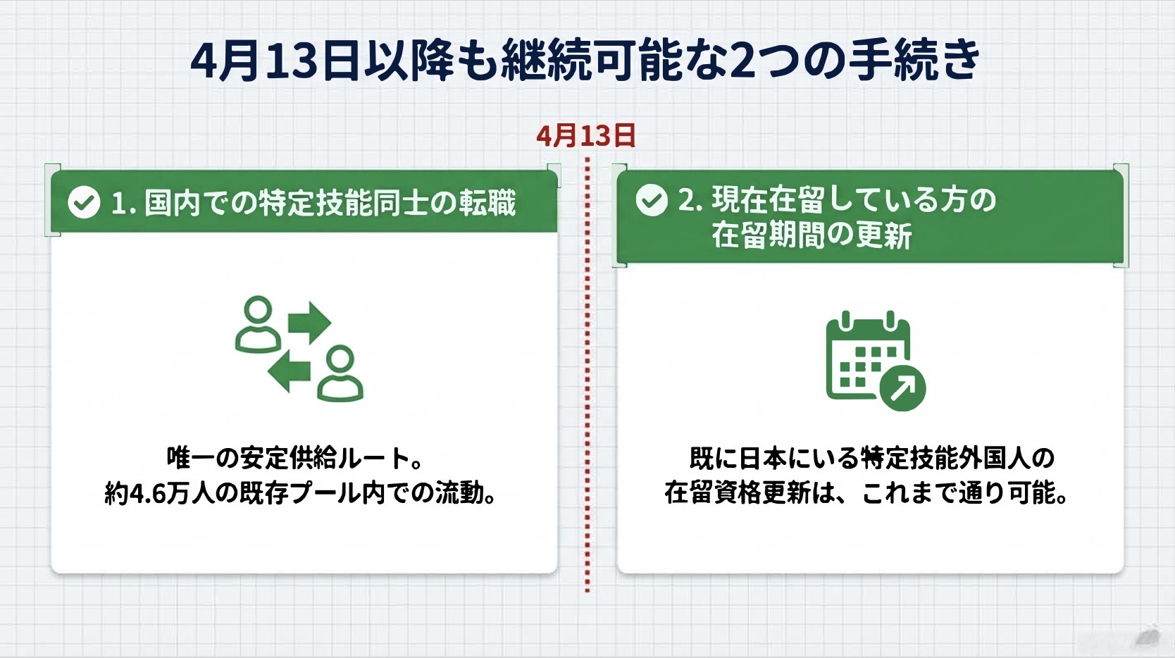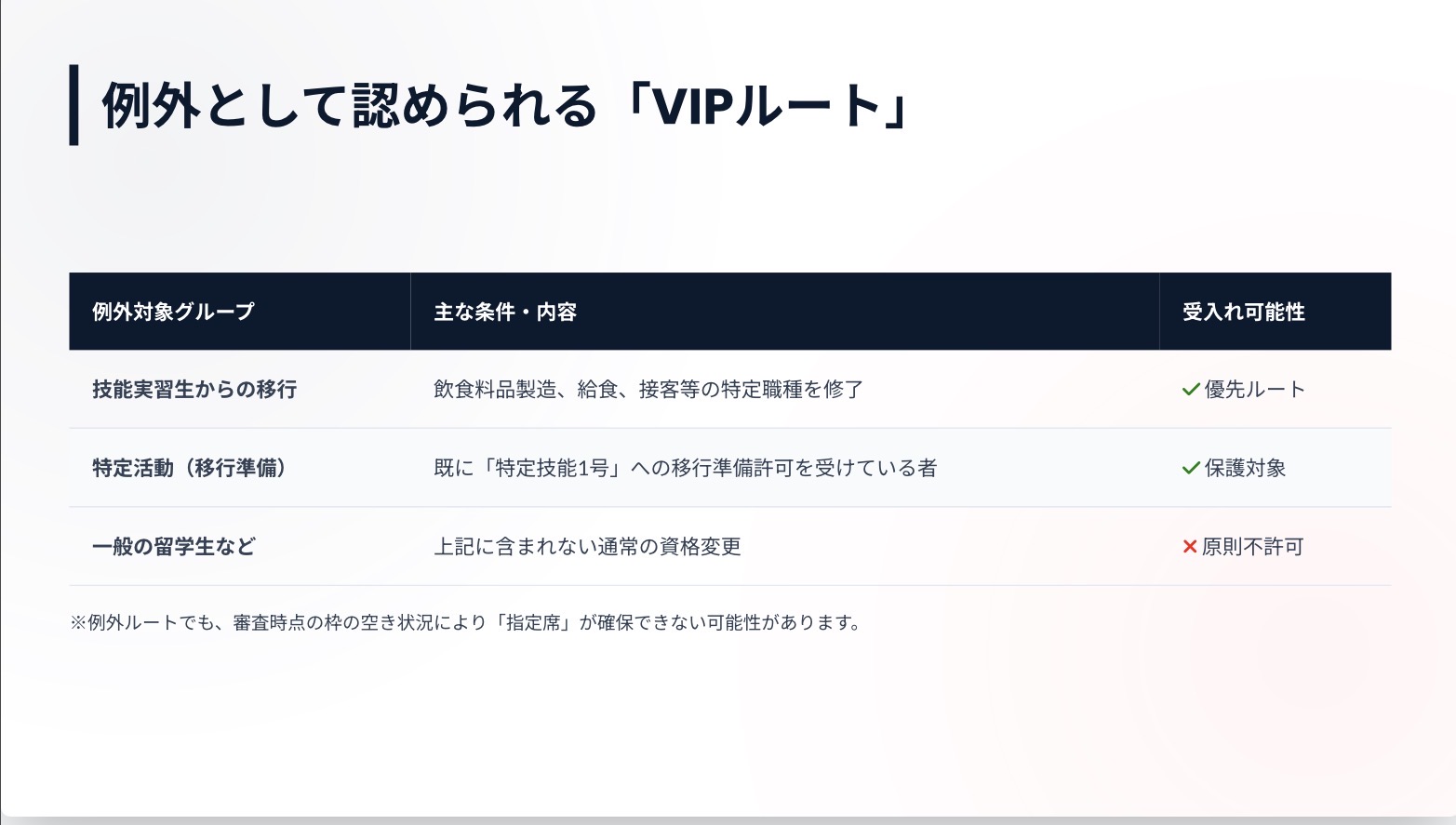 【⚠️注意点】 仮にこの例外ルートに乗れたとしても、審査完了時に全体の枠(5万人)が埋まっていれば、「特定活動」への変更や、1回限りの期間更新しか認められない可能性があると公式資料に明記されています。判断を誤ると不法就労のリスクにも直結するため、自社での独自判断は大変危険です。