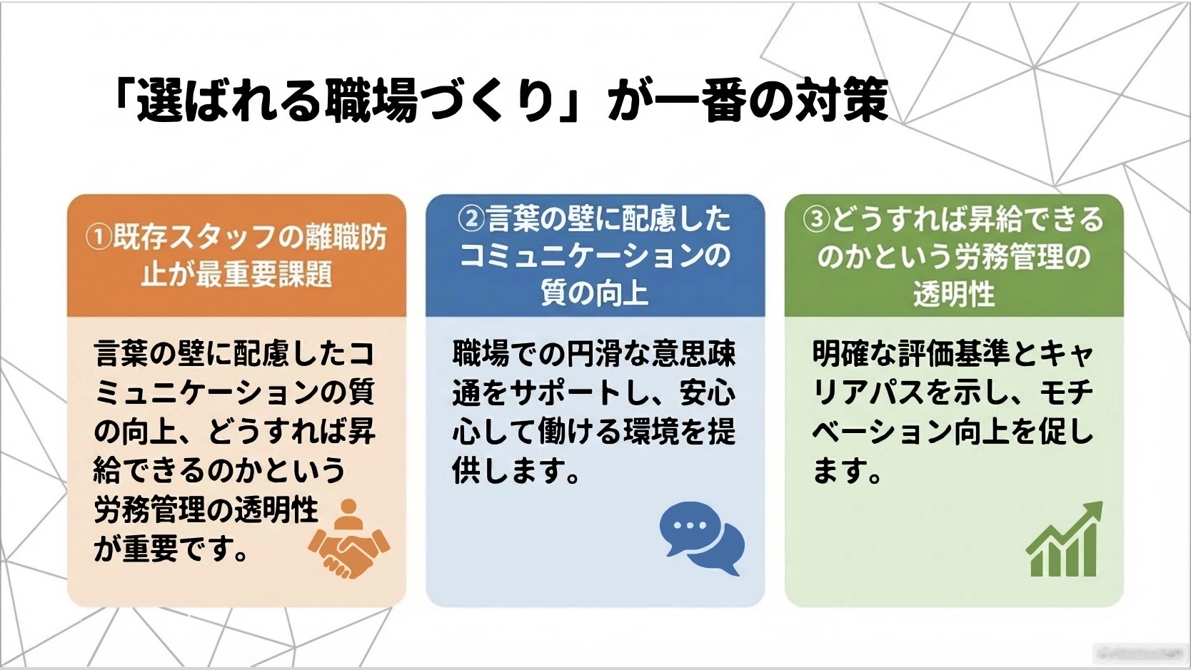 既存スタッフの徹底した離職防止(リテンション) 最も確実な対策は「今いる人材に長く働いてもらうこと」です。言葉の壁に配慮したコミュニケーションや、評価制度の透明性確保など、他社に引き抜かれない「選ばれる職場づくり」が急務です。