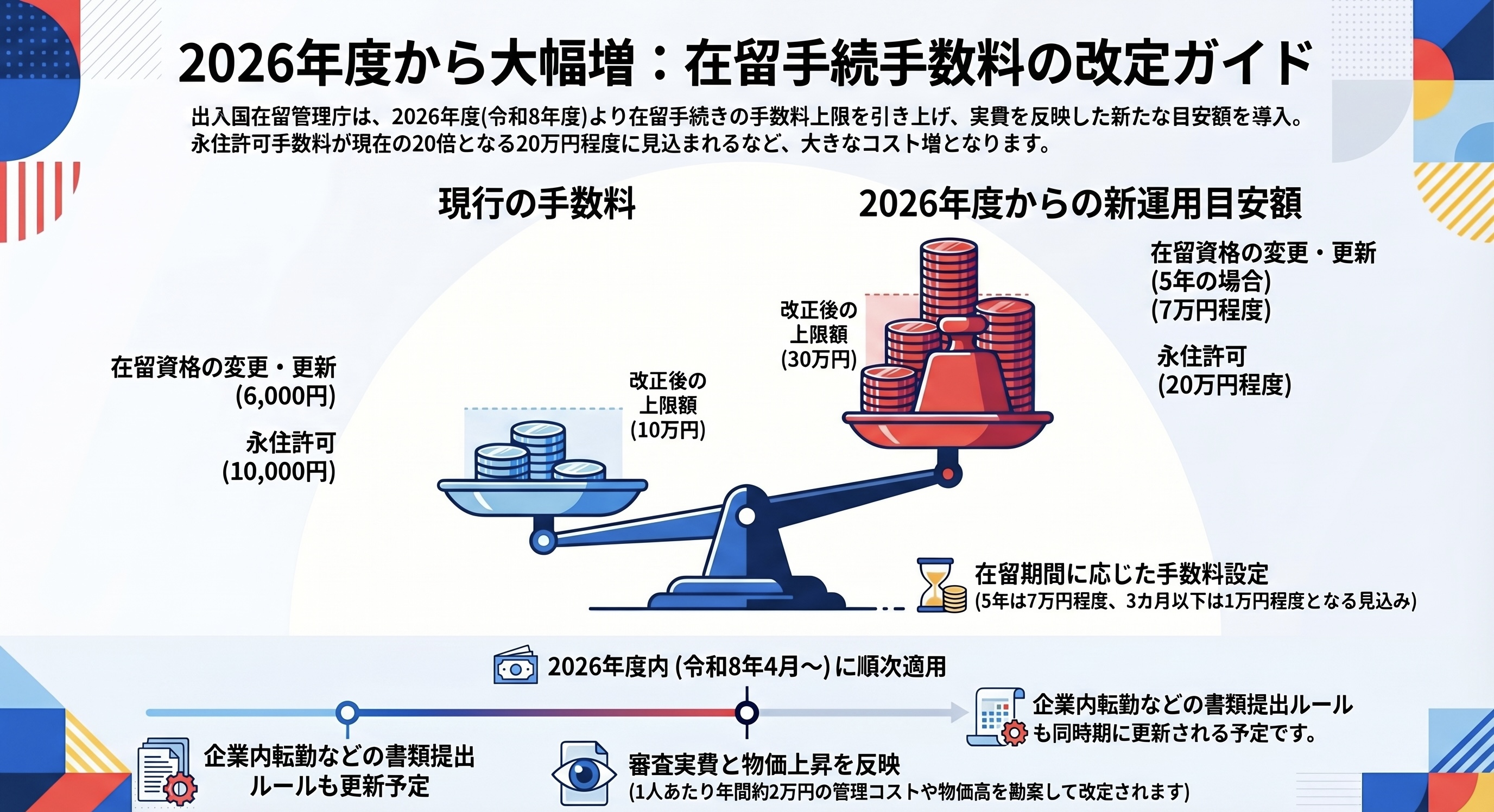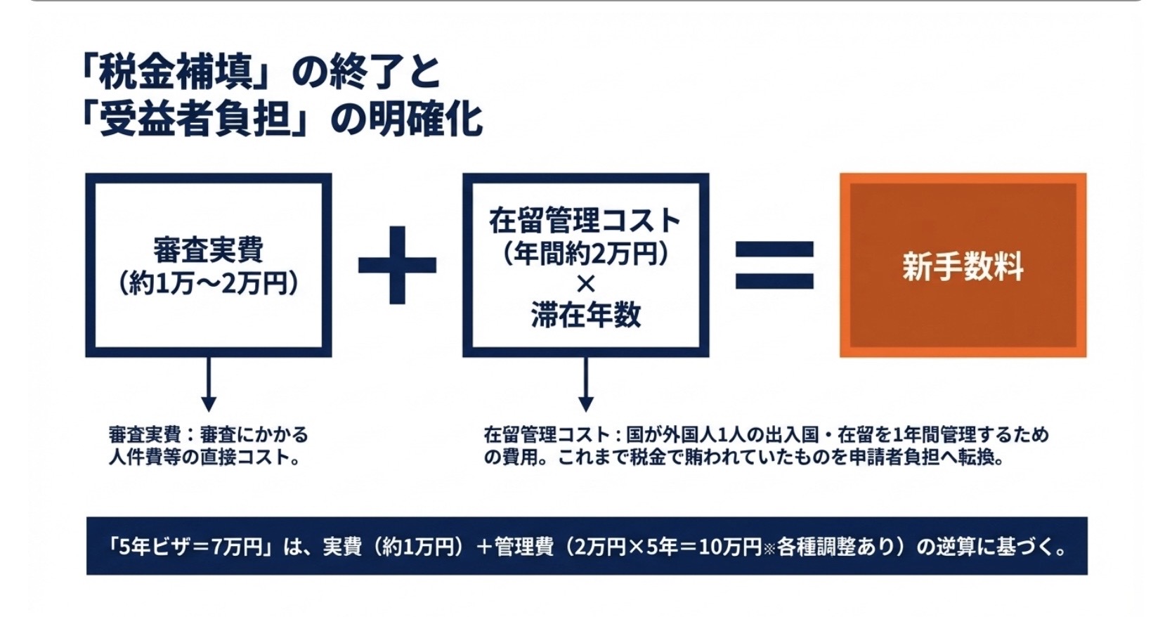 改正の象徴とも言えるのが、申請手数料の劇的な上昇です。これは単なる物価高の影響ではなく、外国人1人あたり年間約2万円かかる「出入国・在留管理コスト」を実費として徴収し、審査を厳格化するための財源となります 。