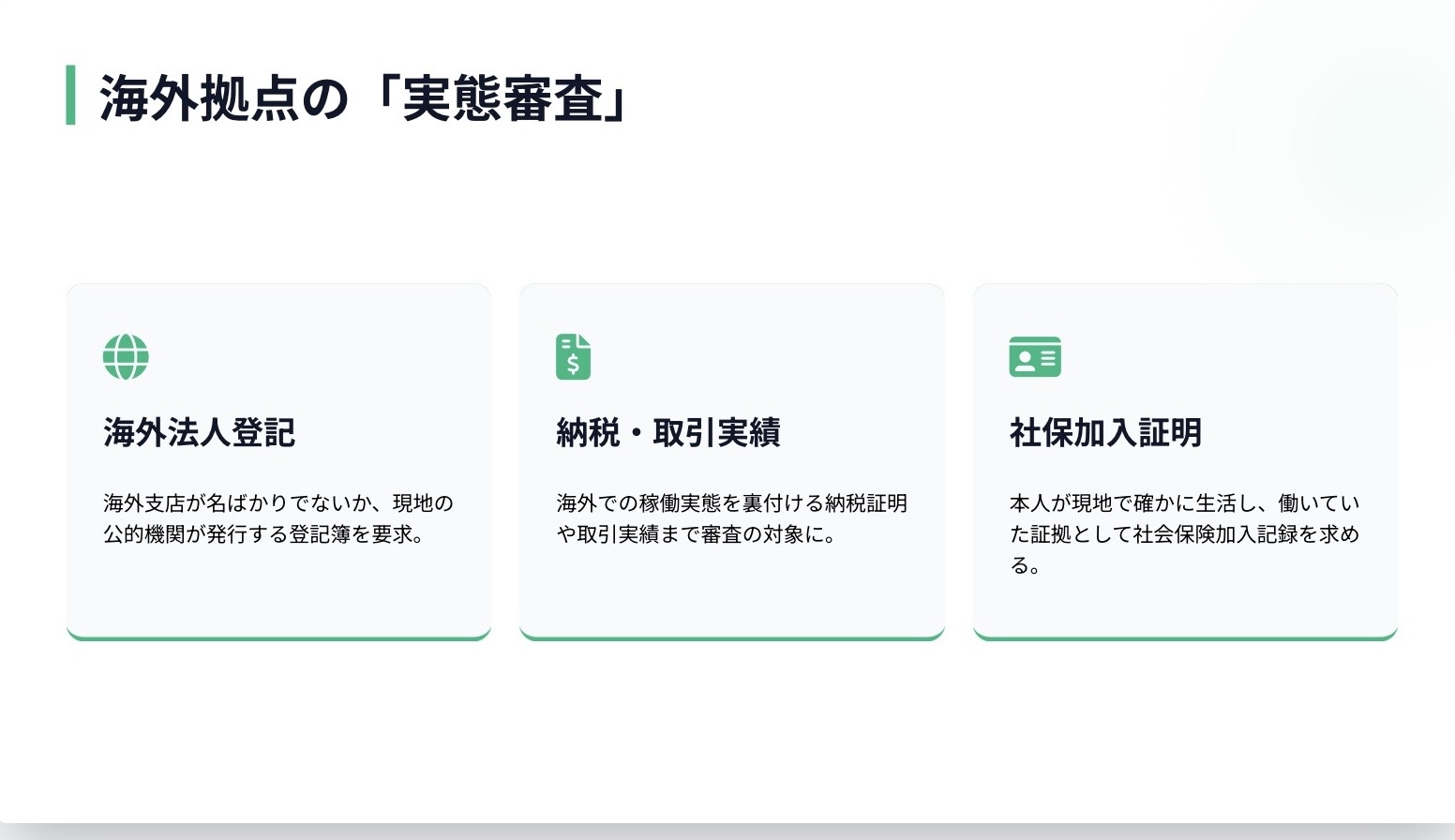 理由: 「名ばかり転勤」による不法就労スキームを排除するため、海外拠点での確実な在籍実態を公的に証明しなければなりません 。