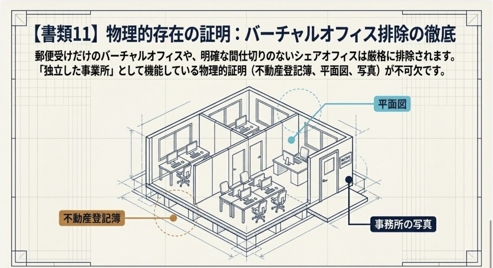 実体証明の3層構造: 「経済的実体(パンフレット等)」「法的実体(登記簿)」「物理的空間(図面・写真)」の3点が揃わなければ、審査を突破することは不可能です 。