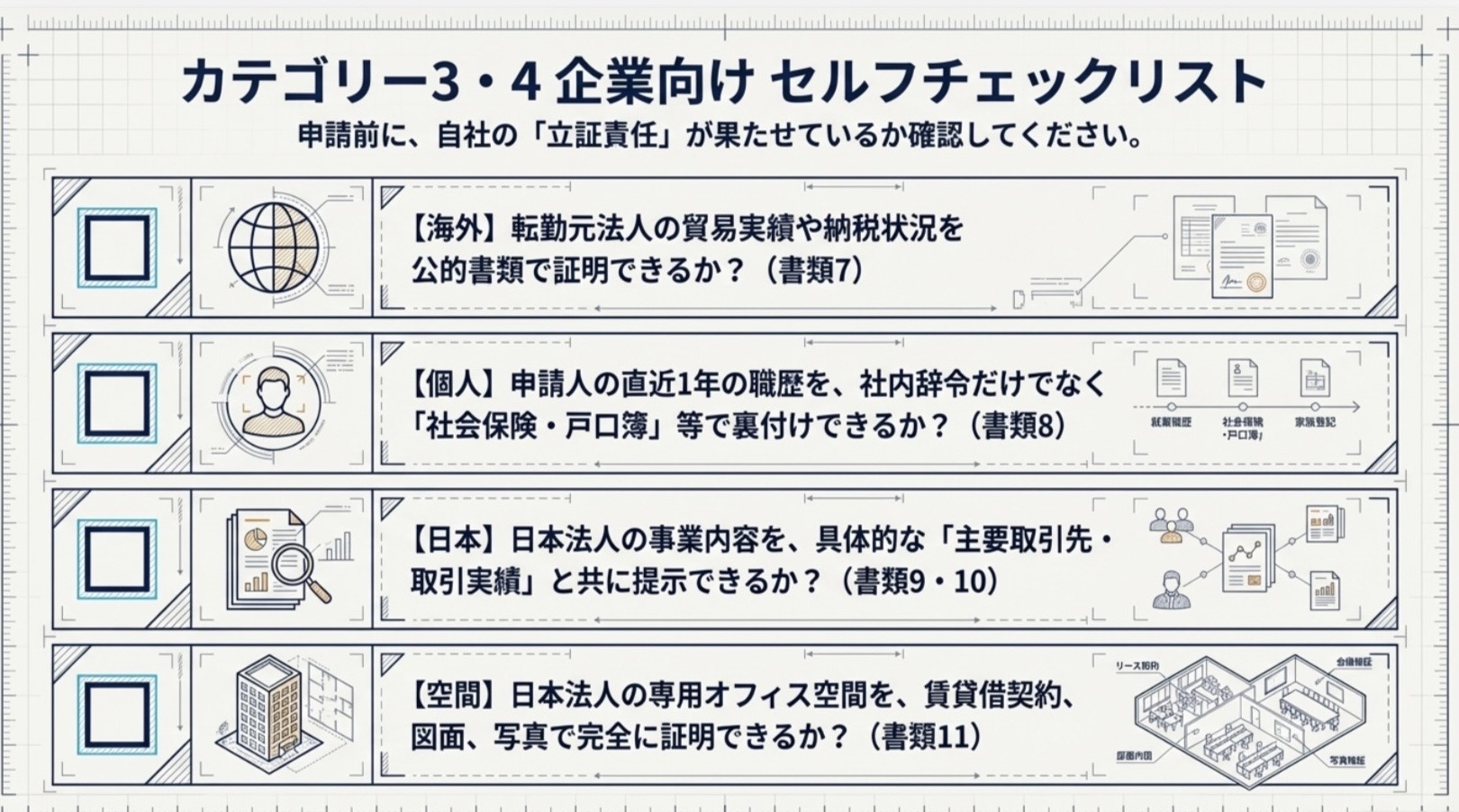海外から社員を呼び寄せる際、カテゴリー3・4の企業には「事業と経歴の実在性」に関する極めて高い立証責任が求められます 。