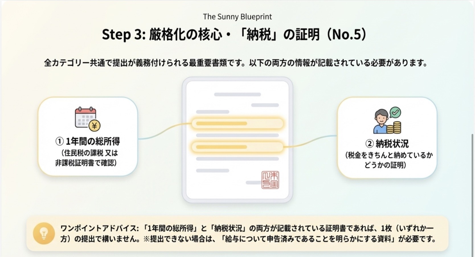 これまでの審査が「法人の適格性」重視だったのに対し、更新時は**「外国人個人の公定義務の履行(納税)」**へ完全にシフトします 。