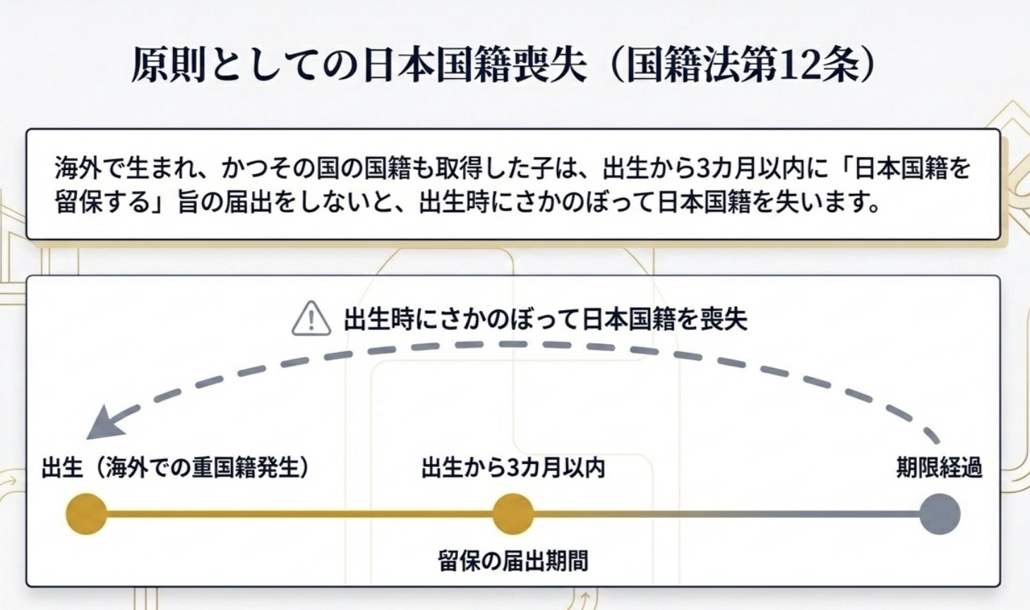 国籍法第12条により、海外で生まれ、かつその国の国籍も取得した(重国籍となった)子は、出生の日から3カ月以内に「日本国籍を留保する」旨を届け出なければ、出生の時にさかのぼって日本国籍を失います。