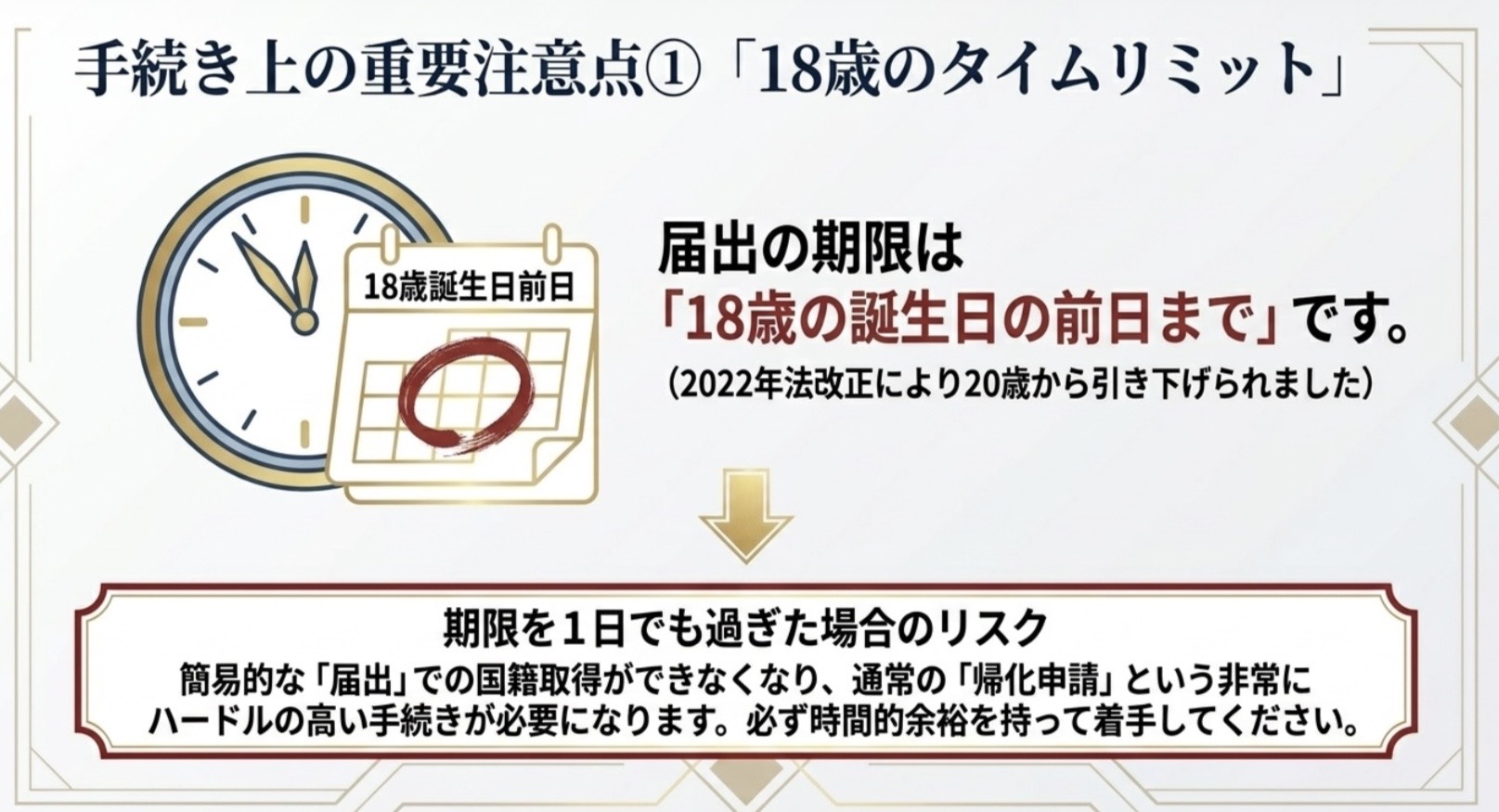 A. 国籍法17条による「届出」はできなくなります。その後は、一般的な外国人と同じ「帰化申請」を行う必要があります。帰化は審査に1年近くかかり、素行や生計能力も厳しく見られるため、18歳までの手続き完了を強くお勧めします。