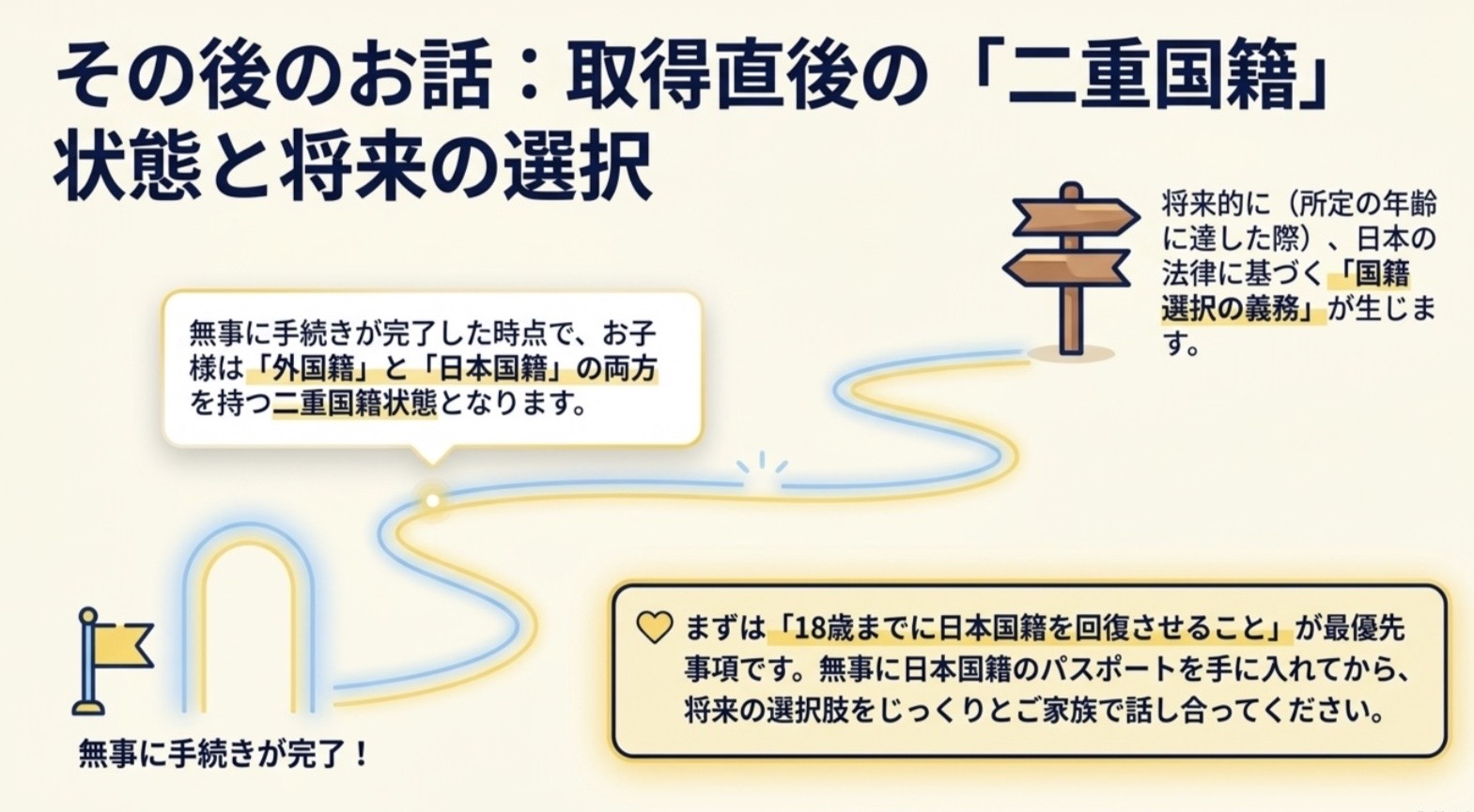 A. この手続きによりお子様は二重国籍となります。日本の法律では将来的に国籍を選択する義務が生じますが、まずは日本国籍を確保し、日本での生活基盤を整えることが最優先です。